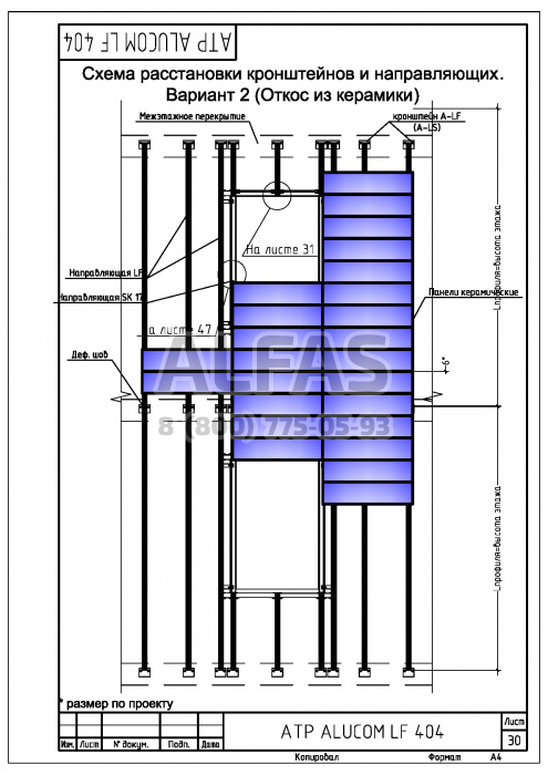 Alucom LF 404 – алюминиевая подоблицовочная конструкция, с креплением только в межэтажные перекрытия. Система разработана для зданий, на которых невозможно применение классической схемы крепления к несущим стенам, из-за низкой несущей способности стен (пенобетон, газосиликат, щелевой кирпич), а возможно лишь крепление в межэтажные железобетонные перекрытия.